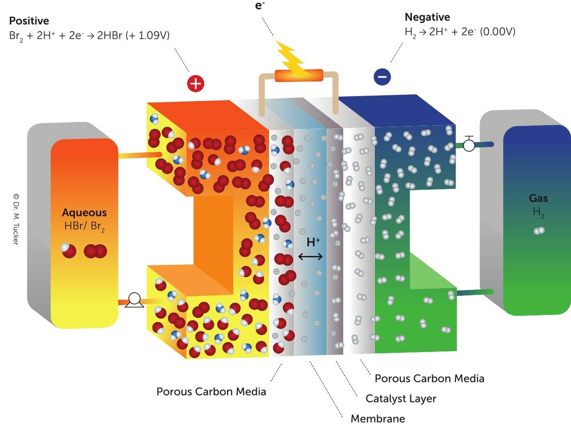 Het hart van alle opslagsystemen van Elestor is de cellenstapel. Deze stapel bestaat uit een aantal individuele elektrochemische cellen zoals hierboven weergegeven, in serie geschakeld. Elk membraan in deze stapel staat aan de ene kant in contact met het elektrolytcircuit, een waterige oplossing van HBr en Br 2, en aan de andere kant met een waterstof (H 2 ) gascircuit. Beide actieve stoffen circuleren in een gesloten lus langs hun eigen kant van de cel. De elektrolyt (HBr/Br 2 oplossing) en waterstof (H 2) circuits zijn gescheiden door een protonengeleidend membraan. Wat er precies gebeurt? “Je stopt er elektronen in en je krijgt er elektronen uit”, zegt Van Bennekom medeoprichter van Elestor. “In de ene tank zit een vloeistof, waterstofbromide. Als je een elektrische spanning op de batterij aansluit, splits je het waterstofbromide in waterstof en broom. Dat waterstof wordt in de andere tank opgevangen. Zo laad je de batterij op. Als je waterstof en broom weer samenvoegt tot waterstofbromide, komt die energie weer vrij en gaat naar het stroomnet. Zo ontlaadt de batterij.”