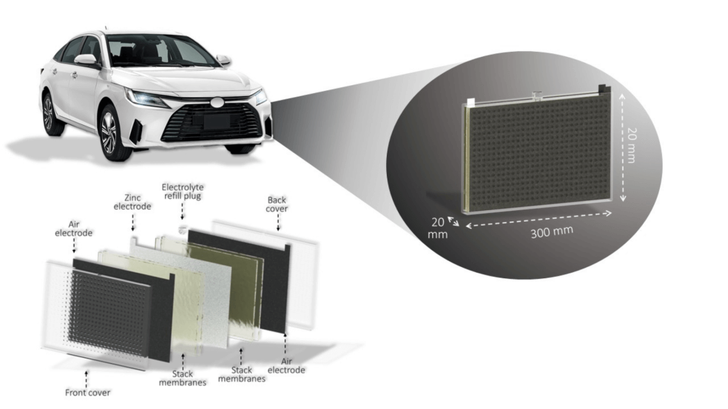 De onderzoekers kozen niet voor lithium en kobalt, maar voor een zink-luchtarchitectuur. Hierbij gebruikt de cel zuurstof uit de omgevingslucht, waardoor veel minder actieve materialen nodig zijn dan in lithium-ion.
