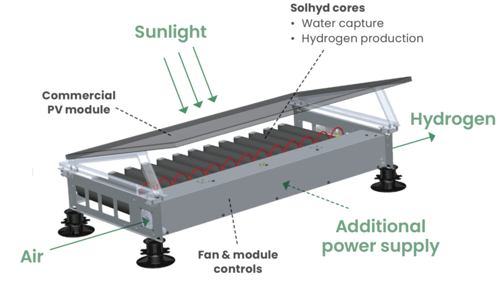 De technologie van Solhyd is gebaseerd op onderzoek van de KU Leuven, waar onderzoeksgroepen al meer dan tien jaar werken aan waterstofproductie uit zonlicht. Het systeem werkt fundamenteel anders dan klassieke elektrolysers. Waar traditionele systemen water splitsen met elektriciteit, haalt Solhyd zijn waterstof direct uit de lucht, via een proces dat geen vloeibaar water, geen zeldzame metalen en geen zware netaansluiting vereist.