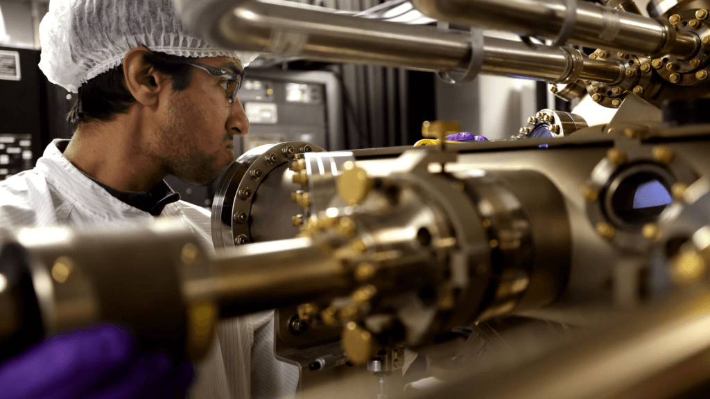 Promovendus Ishtiaque Ahmed Navid werkt aan de precisiegroei van halfgeleiders, een essentiële stap voor opschaling en commerciële toepassing van directe zonne-waterstof. © Brenda Ahearn / University of Michigan