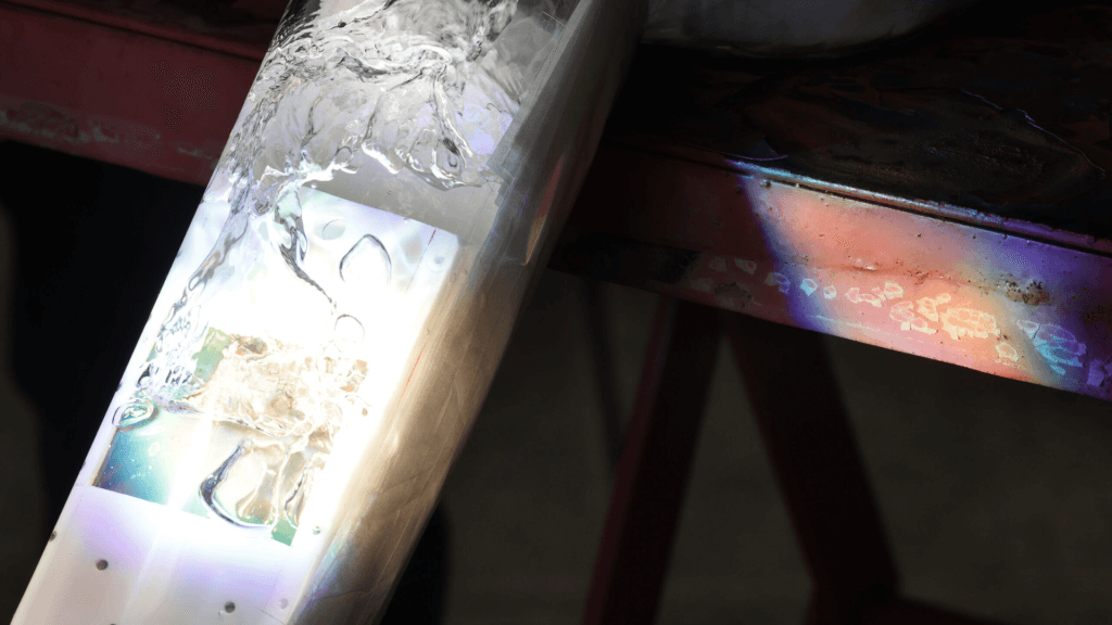 Close-up van het zonnepaneel met de halfgeleiderkatalysator en water. Waterstofbelletjes en zuurstof stijgen op en worden gescheiden in het reservoir. © Brenda Ahearn / University of Michigan