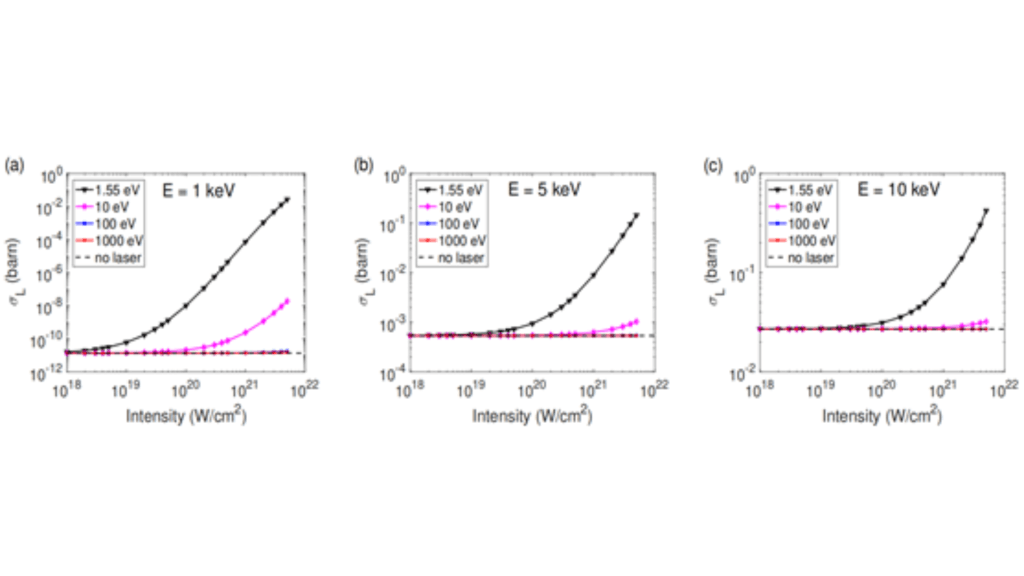 De onderzoekers gebruikten de bekende Deuterium-Tritium-reactie als referentie. Bij een botsingsenergie van slechts 1 keV – normaal gesproken veel te laag voor zinvolle fusie – blijkt laserondersteuning een enorm effect te hebben: