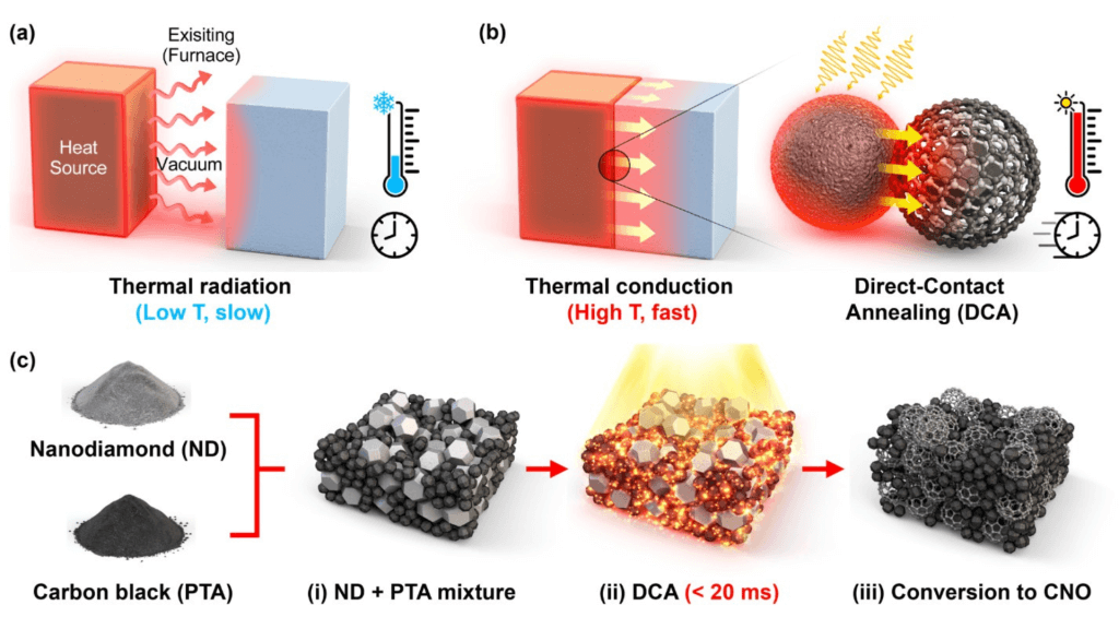 De kern van de innovatie is een zogenoemde direct-contact photothermal annealing (DCA)-methode. Daarbij wordt een zwart fotothermisch materiaal blootgesteld aan een krachtige lichtflits, die binnen 0,02 seconde een temperatuur van 3.000 °C bereikt. Die ultrakorte, maar extreem hete puls verandert nanodiamanten in carbon nanoonions (CNO’s) — microscopisch kleine koolstofstructuren met een ui-achtige, concentrische opbouw.