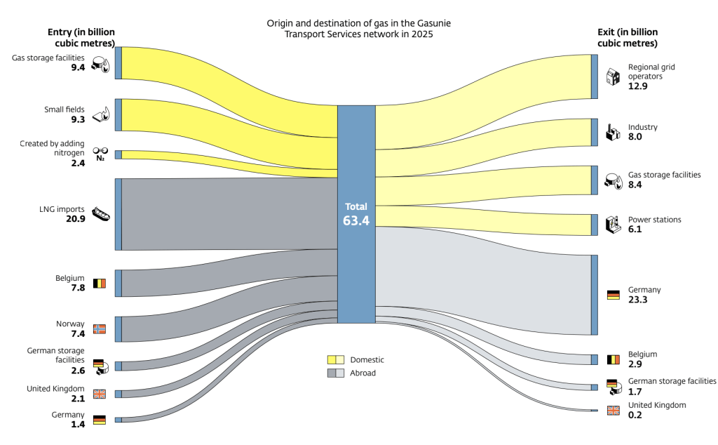 In totaal ging er vorig jaar 63,4 miljard kubieke meter aardgas door het netwerk van Gasunie Transport Services, ruim zes procent meer dan in 2024. Omgerekend vertegenwoordigt dat zo’n 685 terawattuur aan energie, met een economische waarde van meer dan 25 miljard euro. Toch bleef het binnenlandse gasverbruik vrijwel gelijk. Dat lijkt paradoxaal, maar wordt logisch als je kijkt naar waar het gas naartoe ging.