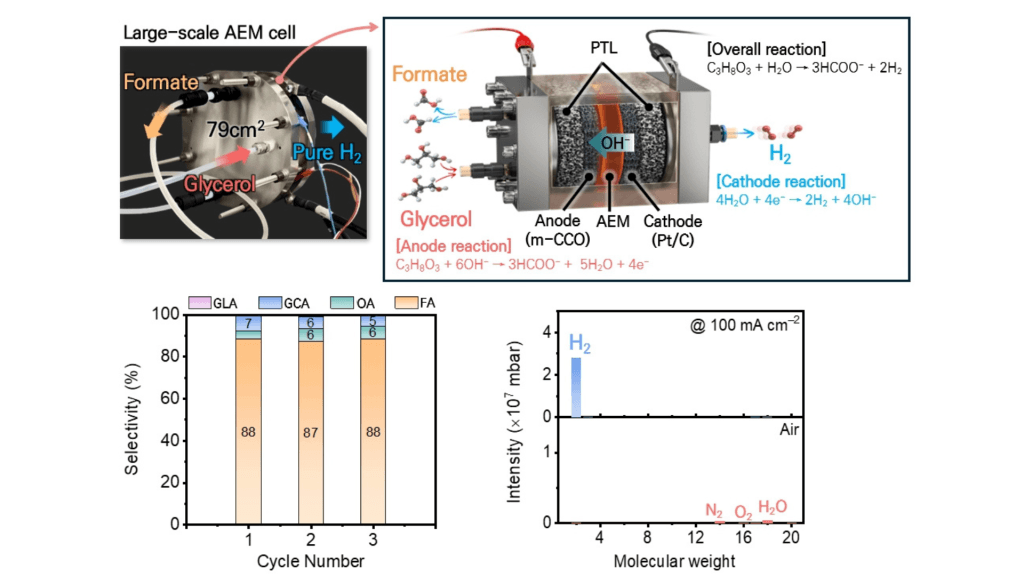 Het onderzoeksteam pakt dat probleem fundamenteel anders aan. In plaats van water aan de anode te oxideren, gebruiken ze glycerol, een goedkoop restproduct uit biodieselproductie. Deze aanpak heet de glycerol oxidation reaction (GOR). Daarbij ontstaat in plaats van zuurstof een waardevol chemisch product, formiaat. Het systeem levert daardoor niet alleen waterstof op, maar ook een verkoopbare chemische grondstof.