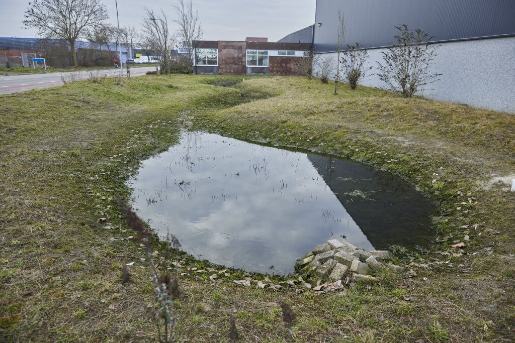 Van de 3700 bedrijventerreinen in Nederland is nog maar 1% ‘groen’ of ‘blauw’, bleek uit onderzoek van het IVN. Maar ze dragen wel fors bij aan de ‘klimaatgevoeligheid’ van de stad. Wat heet: het laaggelegen Euvelgunne had niet alleen zelf last van wateroverlast. Het overtollige regenwater stroomde door het riool naar de binnenstad, vertelt Huizing Buiter: ‘Via een overstort in de kademuren kwam het in de buitenring, maar daar wil je natuurlijk geen rioolwater hebben.’