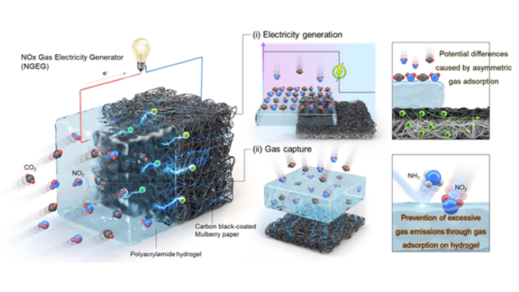 De zogenoemde Gas Capture and Electricity Generator (GCEG) werkt met een asymmetrische structuur die bestaat uit koolstofelektroden en hydrogelmaterialen. Wanneer CO₂ of stikstofoxiden (NOx) in contact komen met het oppervlak van het systeem, worden de gasmoleculen geadsorbeerd.