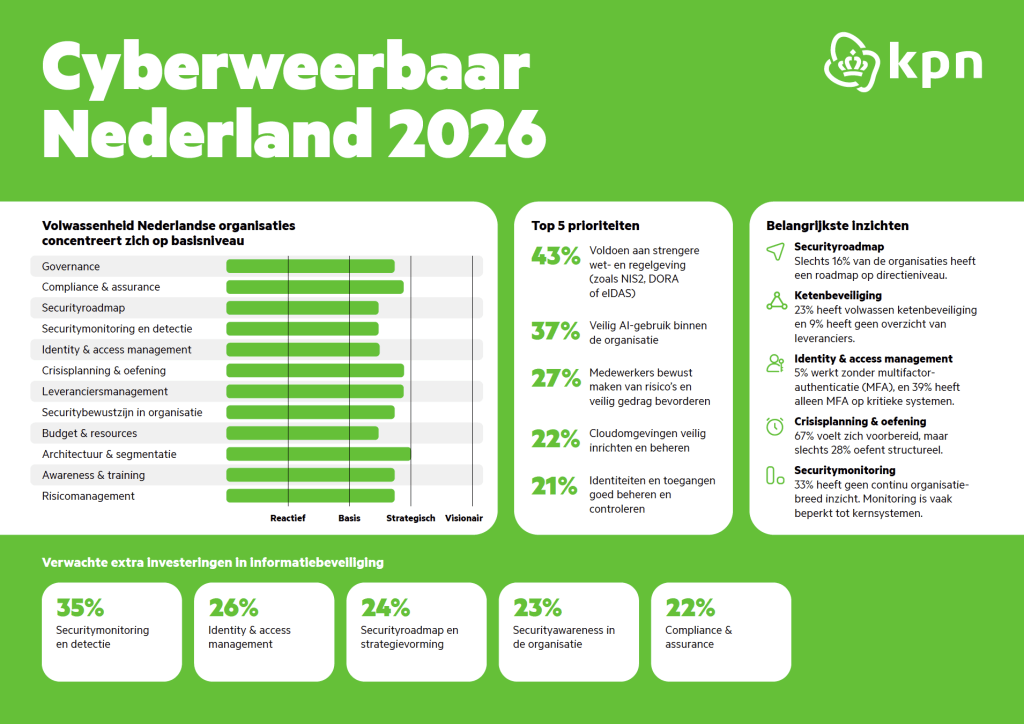 Die conclusie komt uit het onderzoek Cyberweerbaar Nederland 2026, uitgevoerd door KPN onder meer dan 250 IT- en securityprofessionals bij grote organisaties in vitale sectoren zoals energie, zorg, overheid en financiële dienstverlening. Het rapport fungeert nadrukkelijk als meetlat en gesprekstarter, niet als rapport met vinkjes. En precies dat maakt de uitkomsten interessant.