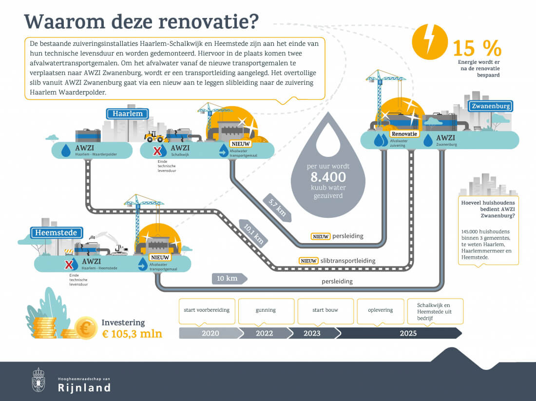 Het Hoogheemraadschap van Rijnland is in januari begonnen met de renovatie en de uitbreiding van de rioolwaterzuivering Zwanenburg in de provincie Noord-Holland. Dat is nodig omdat de afvalwatersystemen van Haarlem-Schalkwijk en Heemstede na dertig jaar aan het einde van hun technische levensduur zijn. Het afvalwater van de afvalwaterzuiveringsinstallaties Heemstede en Haarlem-Schalkwijk zal via nieuwe persleidingen worden getransporteerd naar de rioolwaterzuivering Zwanenburg. In het voorjaar van 2025 moet de renovatie en de uitbreiding klaar zijn.