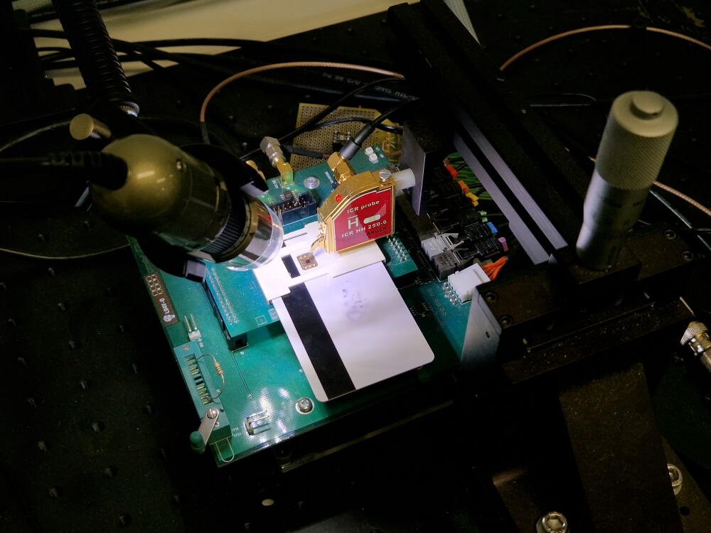 Op een tafel en omringd door apparatuur ligt een kaart met chip op z’n rug. Medewerkers proberen de code te kraken.