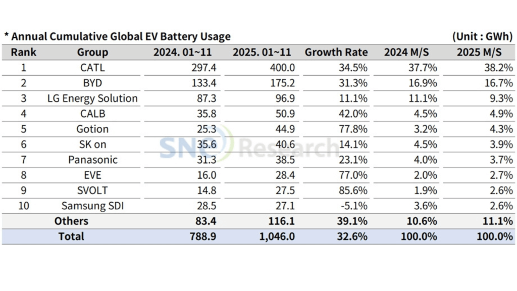 De marktresultaten bevestigen CATL’s dominantie. Volgens de nieuwste cijfers van SNE Research had het bedrijf in de eerste elf maanden van 2025 een wereldwijd marktaandeel van 38,2 procent in EV-batterijen, ver boven concurrenten zoals BYD, dat op 16,7 procent uitkwam.