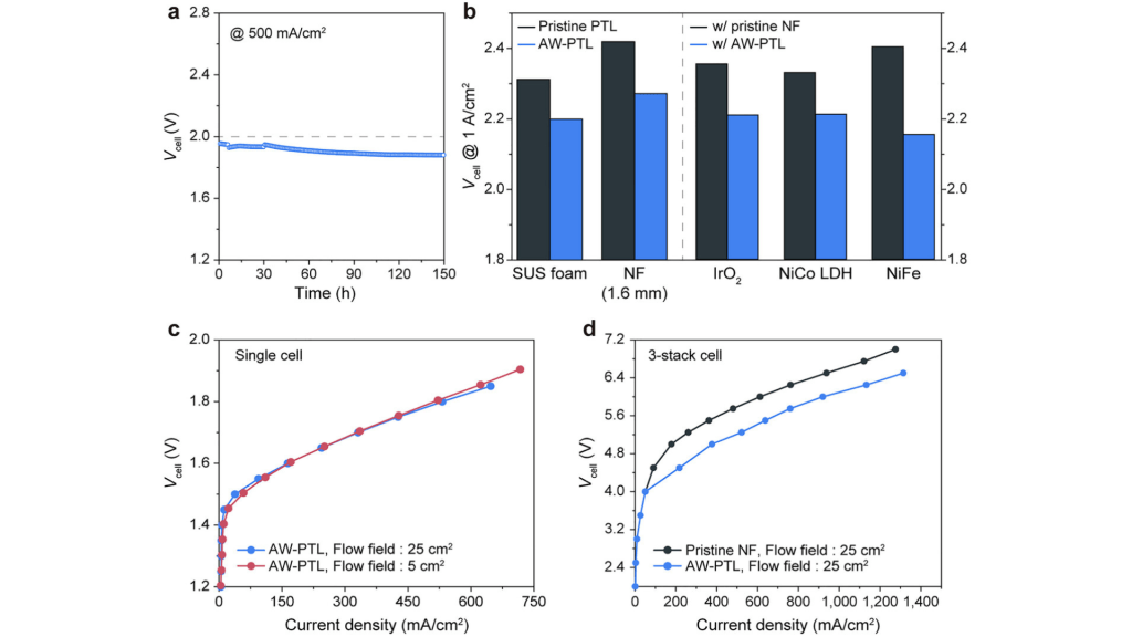 “Hoewel vaak wordt aangenomen dat hydrofiele materialen beter zijn voor wateraanvoer, laat onze studie zien dat een hydrofobe PTFE-coating juist de gasafvoer verbetert en de prestaties verhoogt,” zegt professor Jungki Ryu van UNIST.