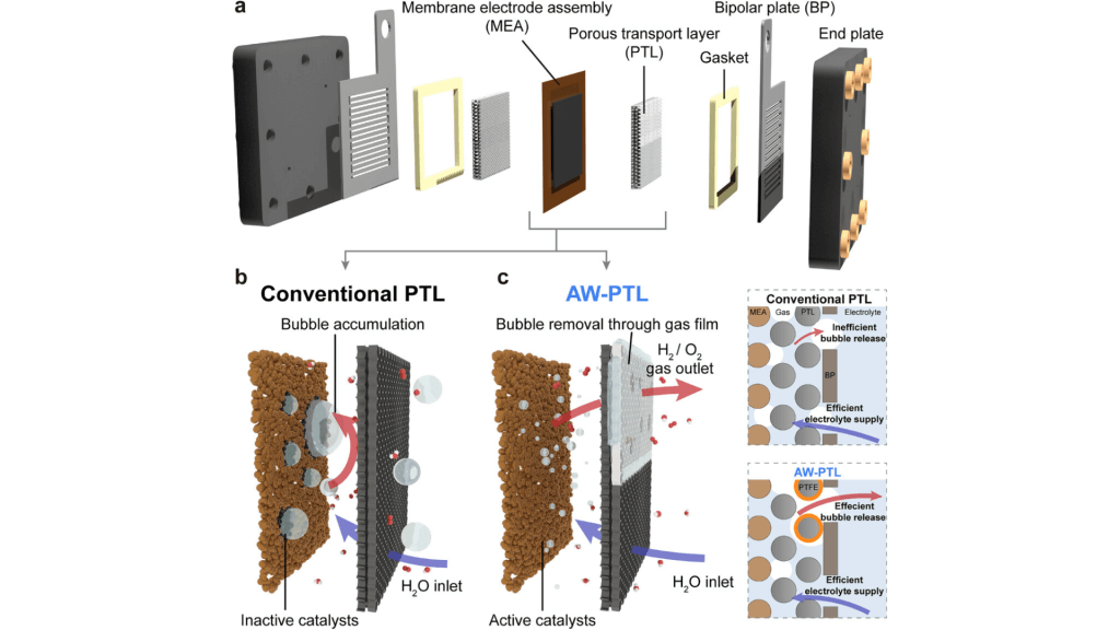 Het team van het Zuid-Koreaanse UNIST bracht PTFE aan op de bovenste helft van de zogenaamde porous transport layer (PTL), een cruciaal onderdeel dat water naar de katalysator brengt en waterstof afvoert. De coating voorkomt dat waterstofbelletjes blijven kleven, waardoor de katalysator altijd actief blijft en de elektrolyse efficiënter verloopt.