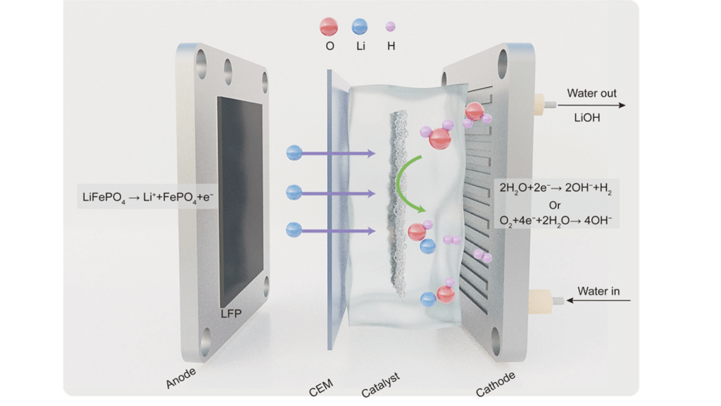 Waar thermische of chemische recycling leunen op ovens en zuren, draait het Rice-proces puur op elektrochemie. De onderzoekers ontwikkelden een membraan-elektrodereactor die afval-kathodemateriaal (zoals zwarte massa van EV-accu’s) behandelt alsof het een batterij is die wordt opgeladen.
